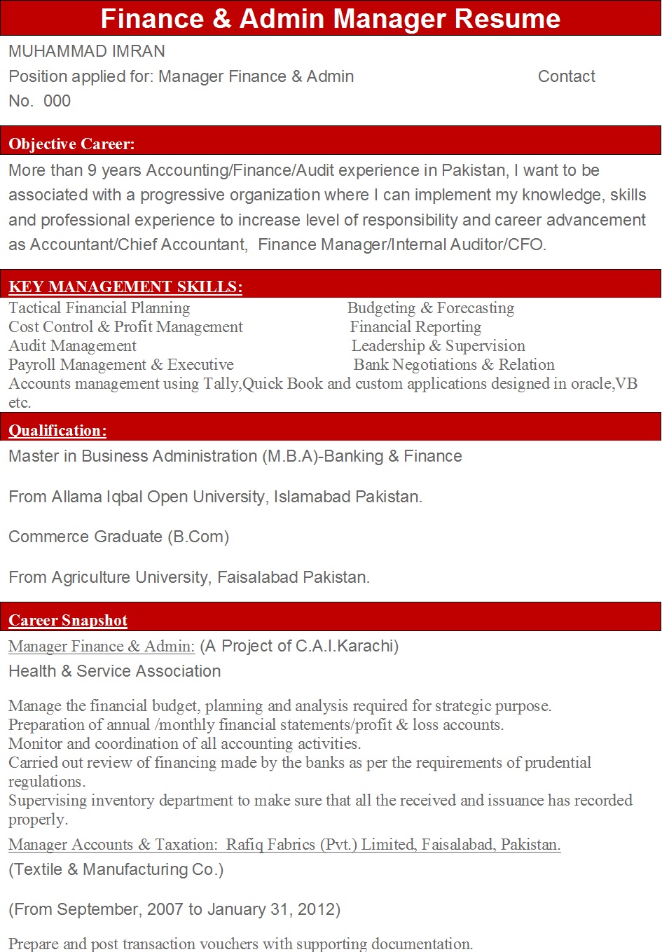 A resume is the most important document in creating your image before the employer/recruiter. This sample resume is for the post of Finance & Admin Manager Resume. Below is given an example that should show you how you can well-construct a resume for a top-level management post. The post of Finance & Admin Manager Resume is a very important one because sheer responsibility or key management skills are required by the employer. Every employer wants to hire a Manager of Finance & Admin who has international key skills. In the resume below you will find precise guidance to describe all your skills and experiences briefly and impressively.